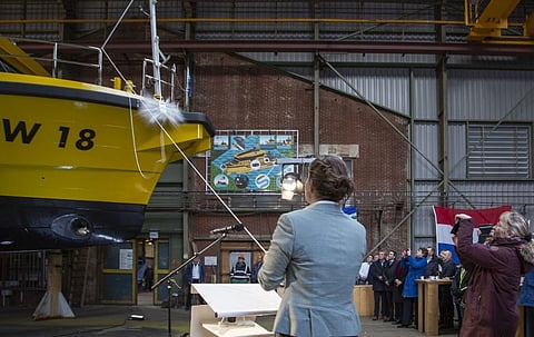 The government of the Dutch province of Groningen christened a new electrically powered workboat at Niestern Sander's shipyard in Farmsum on Thursday, March 14.