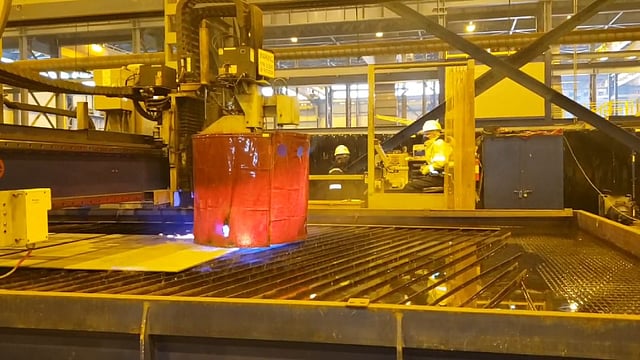 The first steel plates that have been cut will be later joined into a double bottom, mid-ship section.