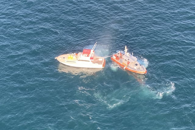 The three men aboard the vessel were reportedly unable to combat the fire and needed emergency assistance.