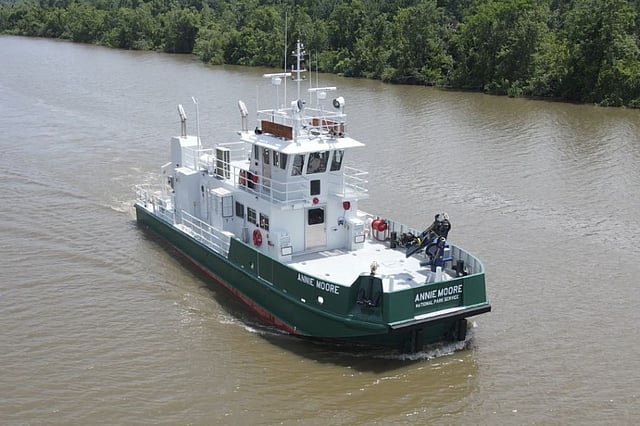 Built by TAI Engineers and Aluma Marine with the assistance of the US Army Corps of Engineers' Marine Design Center, the ABS-classed Annie Moore has a length of 74 feet (22.5 metres), a beam of 24 feet (7.3 metres), a knuckle boom crane, and a main deck with a galley and seating for up to 40 passengers.