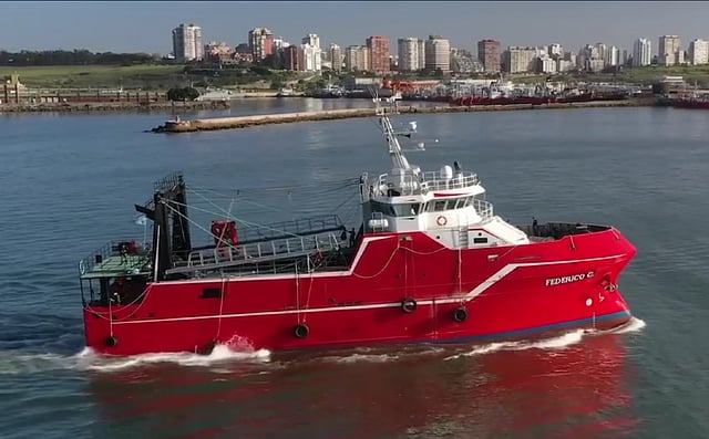 Federico C has an LOA of 39.95 metres, a beam of 9.7 metres, a draught of 4.2 metres, a deadweight of 340 tonnes, and space for 32 crewmembers. The yard said the vessel is also the first in the Argentine fishing fleet to be fitted with an inverted bow meant to maximise the waterline and thus improve hull speed to ensure more fuel-efficient sailings.