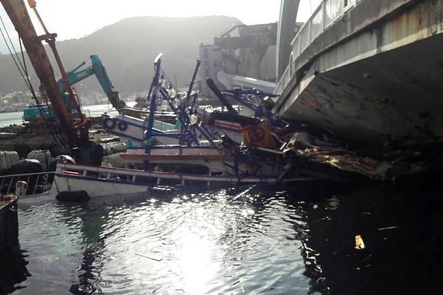 The incident occurred on the morning (local time) of Tuesday when one of the cables on the centre section of the Nanfangao Bridge's steel arch suddenly snapped, sending the entire 140-metre-long single-span structure crashing down on and seriously damaging three fishing vessels that were moored underneath.