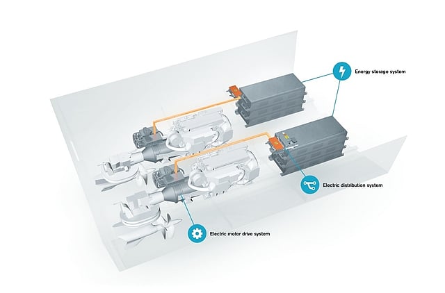A clutch and electric motor are added between the engine and the IPS pod. The electric motor is supported by scalable (depending on application needs) Li-ion battery packs that can be charged externally using AC or DC chargers; or recharged using the primary diesel engine. Opening of the clutch allows the boat to run in electric-only mode, and with the clutch closed both diesel and electric power can be used in parallel. In terms of operation, the captain will use the familiar control interfaces of the IPS system, with the addition of new drive modes to choose from.