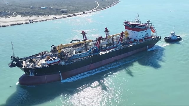 The TSHD is powered by 25,000 horsepower (18,642 kilowatts) and is equipped with triple azimuthing stern drives and twin bow thrusters.