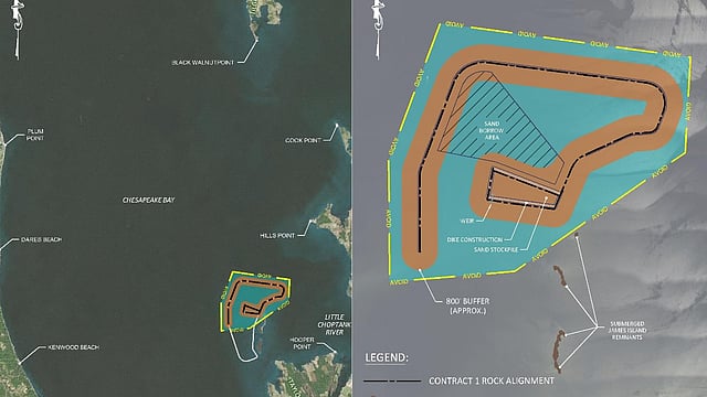 The project is a 65 per cent federal and 35 per cent state cost-share partnership involving the restoration of 2,072 acres (838.5 hectares) of habitat on James Island and 72 acres (29.1 hectares) on Barren Island. Material dredged from the Port of Baltimore and shallow navigation channels will be used to form these areas.
