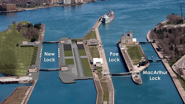 The Soo Locks allow vessels to transit the 21-foot (6.4-metre) elevation change on the St Marys Falls Canal, but over 88 per cent of commodity tonnage is restricted to the single Poe Lock. The project will construct a second Poe-sized lock.