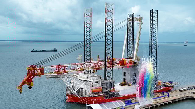 Cadeler said Wind Ally's design is tailored to meet the increasing size and complexity of offshore wind turbines and foundations. With a deck space of 5,600 square metres, payload exceeding 18,000 tons, and a main crane capable of lifting above 3,300 tonnes at 39 meters, the WTIV can transport and install up to six sets of XXL monopile foundations per load.