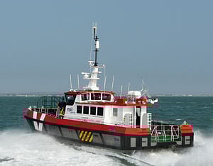 Powered by twin Scania DI16 43M 600kW diesel engines coupled to UJ452 water jet units, the vessel achieved a sprint speed of 25 knots in trials and is capable of cruising at speeds in excess of 22 knots in departure condition. A hydraulics system driven by both Twin Disc gearboxes powers a Palfinger PK4501M fully folding knuckle boom crane forward, 5.0-bar, 30,000-litre per hour fire pump, 1.5-tonne hydraulic capstan, 210-bar, 30-litre-per-minute pressure washer system and a 3.5tm3, 8.0-bar, 40-metre fuel transfer system. The integrated system offers full redundancy from two supplies.