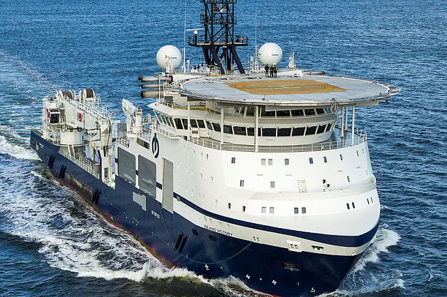 The Kongsberg Maritime-designed vessel has been named Island Victory. It has a length of 123 metres, a beam of 25 metres, 1,200 square metres of deck space, and a 250-tonne crane.