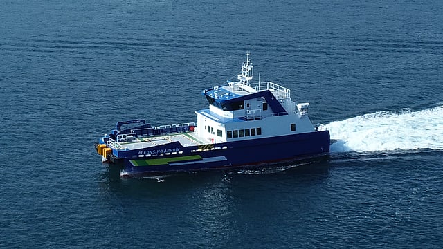The catamaran vessel Alfonsino Arrow was built by Kosaba Shipbuilding. She will be used to transport personnel involved in the construction and maintenance of offshore wind power facilities across Japan, particularly along the coasts of Oga, Katagami and Akita.