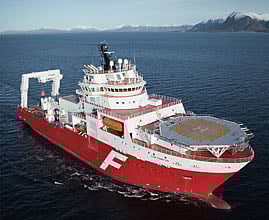 The vessel is 121.5 metres long with a 26-metre beam, weighing 15,260GT with a hull strengthened to Ice Class 1B, and is capable of 19 knots at top speed. A Rolls-Royce propulsion system combining diesel electric and diesel mechanical transmission provides optimal operating flexibility, fuel economy and minimum exhaust emissions.