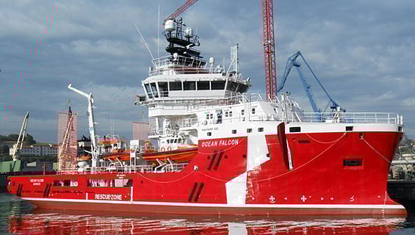 'Ocean Falcon' incorporates the latest technologies including systems for towing operations with a pulling capacity of 65 tonnes. With 66.80 meters length and 16 meters beam, it has the capacity to rescue 300 people. It has twin MAN main engines with a power of 1,935kW each.