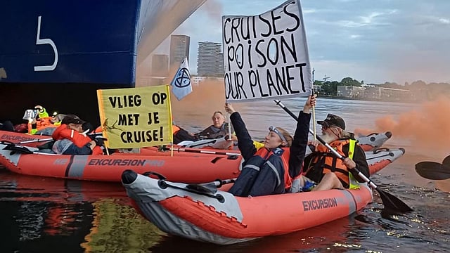 Protesters from the Dutch arm of environmental activist group Extinction Rebellion attempted to prevent a cruise ship from docking in the Port of Amsterdam on Saturday, July 26.