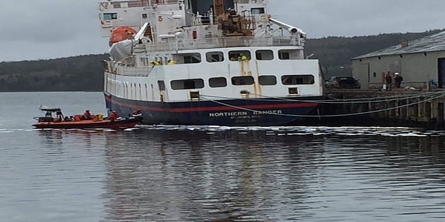 The Department of Fisheries and Oceans (DFO) confirmed that the waste oil tank on the decommissioned government-owned ferry Northern Ranger had overflowed and had spilled some of its excess contents over the side of the vessel.