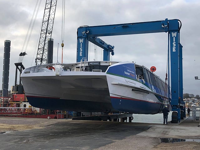 Venus Clipper, a new catamaran ferry being built for London-based MBNA Thames Clippers, was lowered into the water for the first time on Thursday, February 14.
