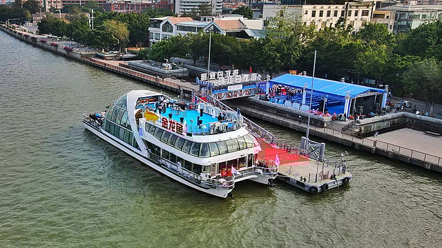 A new electric-powered sightseeing boat built in China departed on its maiden voyage on the Pearl River in the city of Guangzhou on Tuesday, March 30.