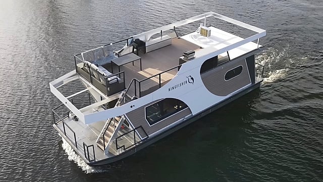 The houseboat features underfloor heating, air conditioning, and a wastewater treatment system. The prototype is also equipped with solar panels on the wide roofs. These can generate additional energy of up to three kWh during longer periods of mooring.