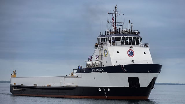 Aquinnah is one of three platform supply vessels (PSVs) purchased by the Steamship Authority in 2022 from Hornbeck Offshore Services of Covington, Louisiana, as replacements for ageing freight vessels with open decks that had also been originally built as PSVs.