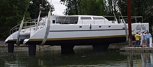 The twin hulls were rolled upright and bulkheads and fore and aft cross beams were installed, giving the boat its final width of 11 metres. The structural under-surface of the bridge deck was assembled and laminated as a single piece in an adjacent bay, then jacked into place between the hulls and bonded to the sheer line and beams. The compound-curved deckhouse roof was laminated in place over a temporary form erected in the main cabin. During construction, the boat was regularly examined by U.S. Coast Guard safety inspectors, and is certified to carry 100 passengers and ten crew.