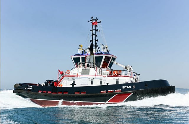 The 30.25-metre Eitan is powered by two Caterpillar 3516C engines each rated 2,525 kW at 1,800 rpm, enabling the tug to achieve speeds of up to 13.25 knots and a bollard pull of 73.5 tonnes.
