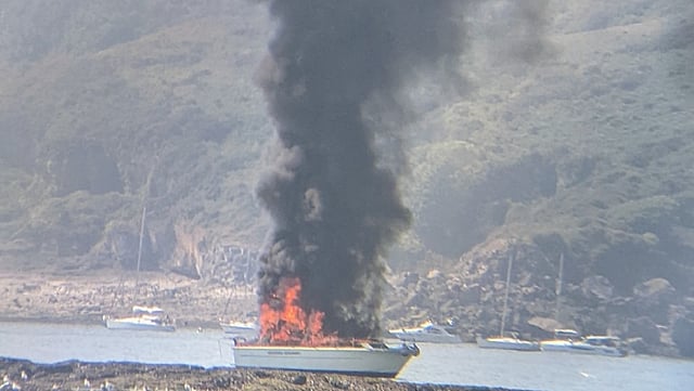 Personnel from HM Coastguard and the Royal National Lifeboat Institution (RNLI) at Mumbles in southern Wales responded to an incident involving a pleasure craft that caught fire on Saturday, August 13.