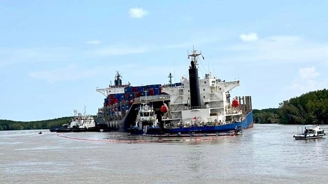 The containership suffered a damage bow whereas the bulk carrier's stern was breached, causing oil to spill into the river.