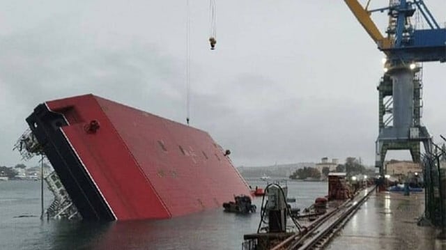 Russian media said the vessel's crane was undergoing testing when the vessel itself suddenly overturned in Yuzhnaya Bay on Tuesday afternoon (local time).