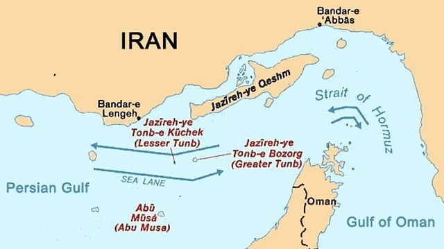 The strait links the Persian Gulf to the Gulf of Oman and the Arabian Sea beyond.