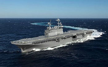 The America-class vessels measure 257 metres long and 32 metres wide and are powered by two gas turbine engines.