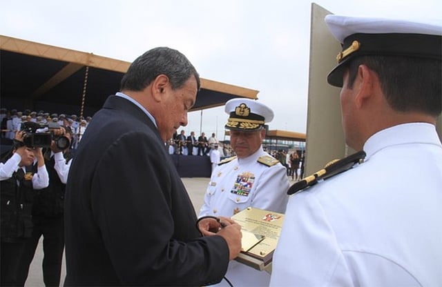 Defence Minister Jorge Nieto Montesinos led the ceremony for the second of two navy's LPDs. The lead ship in the class, BAP Pisco was launched in April and is expected to be commissioned in 2019.