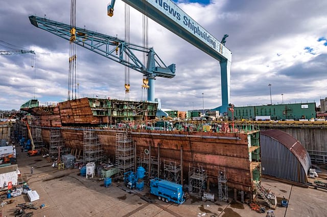 They are pre-outfitted and hoisted into Newport News Shipbuilding division's Dry Dock 12 by the company's 1,050-tonne gantry crane.