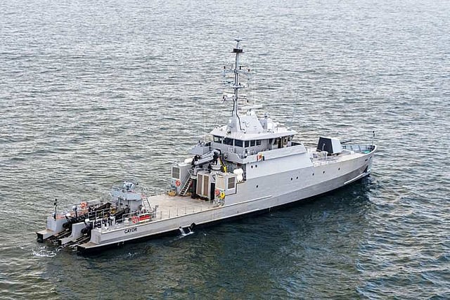 The armament includes Marte MK2/N anti-ship missiles, Mistral surface-to-air missiles, a Leonardo 76mm rapid-fire naval gun, two Nexter Narwhal 20mm autocannons fitted on remote weapon stations, and two 12.7mm machine guns. A Polaris combat management system supplied by the Naval Group is used in conjunction with the various onboard weapons.
