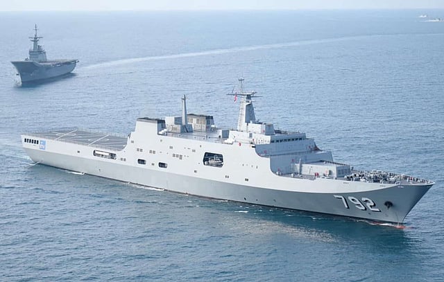 The ship can embark up to 800 troops, various conventional and air-cushion landing craft via its well deck and side davits, 60 armoured fighting vehicles, and four transport/utility helicopters. As with the Type 071 ships on which it is based, it may also support counter-piracy, humanitarian and disaster response (HADR), and search and rescue (SAR) missions.