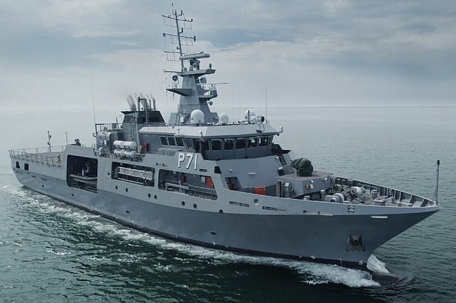 With a full load displacement of over 2,000 tonnes, a length of 74.8 metres, a beam of 13 metres, and a draught of 3.8 metres, the OPV can accommodate a crew of nearly 50 plus an additional 20 personnel. The elevated bridge offers 360-degree visibility and is equipped with ballistic protection according to STANAG 4569 level 2.