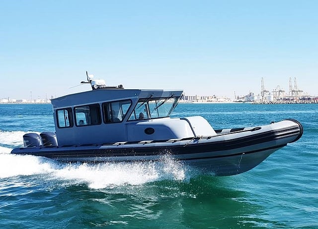 The RIB has a hybrid construction of aluminium and fibreglass, an air-conditioned cabin, a forward berthing area for two people, and three Yamaha 260kW outboard engines delivering a maximum speed in excess of 52 knots.