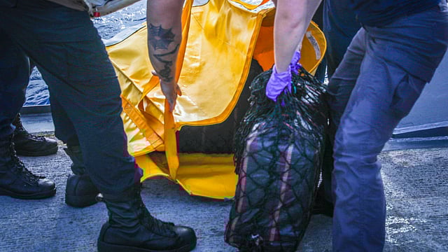 Sampson launched two boarding teams, which recovered several of the jettisoned packages and took positive control of the suspect vessel. Coast guard law enforcement personnel conducted a boarding and determined the vessel to be without nationality, granting authority for a full law enforcement boarding.