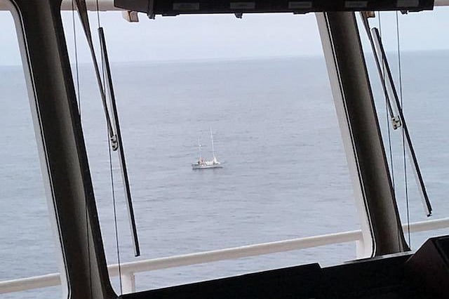 The containership arrived on-scene and established verbal communications with the man who wanted to abandon his vessel and come on board due to his vessel no longer being safe or seaworthy.