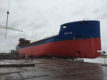 The 'Eeva' was towed on a barge to a floating dock in Stettin, Poland where the launch took place. Construction of the vessel will be undertaken in Papenburg. Germany.