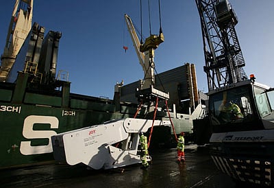One of more than 180 mine arches, each weighing in excess of 27 tonnes, is loaded onto a Rickmers-Linie vessel bound for China.