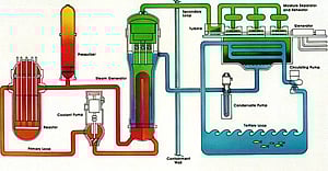 PWRs are very stable due to their tendency to produce less power as temperatures increase. Water in the secondary loop is separate and not contaminated by radioactive materials. The control rods are held by electromagnets and fail-safe falling by gravity when current is lost. Full insertion safely shuts down the primary nuclear reaction. However, the post shutdown period of one to three years requires cooling. It is this cooling that failed at Fukushima, causing high temperatures to separate water into hydrogen and oxygen, causing explosions.