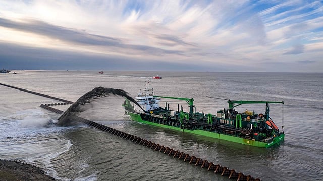 The trailing suction hopper dredger Meuse River is currently performing rainbowing works as part of the dredging and land reclamation activities. These specific components of the project were designed to facilitate the handling of wind turbine parts.