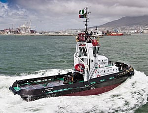 The 'Osayame' is a Damen-designed Azimuth Stern Drive tug 3211 has a bollard pull of nearly 70 tonnes from its 4,175kW Caterpillar engines. The Lloyd's Registered escort tug has full fire fighting and pollution control capability along with its towing, line handling and escorting functionality.