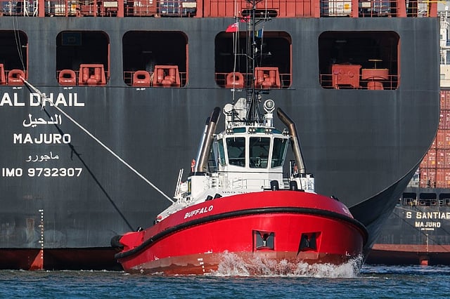 Used for manoeuvring container ships at the terminal, the twin-fin, 24-metre by 13-metre tug Buffalo has 72 tonnes of bollard pull.
