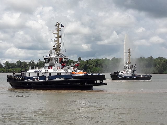 The reverse stern drive (RSD) WID tug Fregate has 42.5 tonnes of bollard pull as well as a water injection dredging (WID) system that enables it to maintain the depths of the harbours of Cayenne and Kourou in French Guyana.