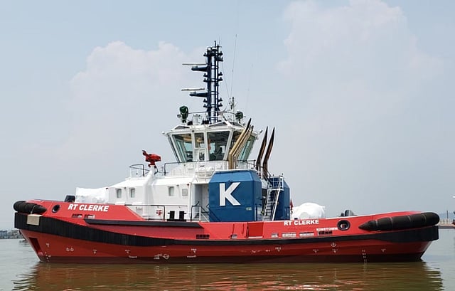 The Robert Allan Ltd-designed RT Clerke has a length of 32 metres and a beam of 12.6 metres. Three Caterpillar main engines with a total output of 5,295 kW deliver a speed of 13 knots and a bollard pull of 80 tonnes.