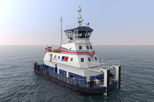 The vessel will have an LOA of 28 metres, a moulded beam of 10.5 metres, a maximum draught of 2.5 metres, and two MTU 8V4000M55R-N Tier III main engines connected to an LNG propulsion system.