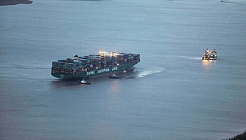 It took 12 tugs with a combined pulling force of more than 1,000 tonnes and a Spring tide to pull the box carrier free. Five tugs were required to tow and position her in the Hamburg docks where the ship is undergoing inspection.