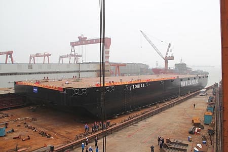 The 'SPo 12032' is 120 metres in length with 32.2 metres across her beam. The pontoon was launched at Jiangsu Ganghua Shipyard, one of Damen's Chinese partner yards. With deck strength of 20 t/m², its heavy-duty deck is suitable for heavy roll-on/roll-off operations. The pontoon's ballast system includes Econosto valves and Azcue pumps. Furthermore, the 'SPo 12032' is equipped with two DMT-winches, a Van der Leun electrical system (incl. a Caterpillar generating set), an International Paint system and is classified under Lloyd's Register.