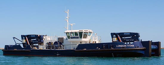 With a displacement of more than 600 tonnes and total installed power of 2,300kw, the 'London Titan' has two identical folding cranes which are capable of lifting loads of up to 25 tonnes. The vessel's unique design means she can work both at sea and in the higher reaches of the River Thames, with a shallow water draught and low air draught allowing access up river all the way to Richmond Lock, as her folding deck cranes will allow safe passage through the bridges of central London.