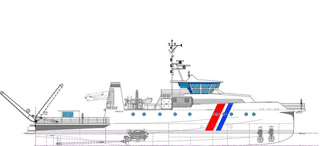 The vessel will have a hull made from recycled high quality FRP, an LOA of 46 metres, a beam of 9.2 metres, a draught of 3.2 metres, a range of 3,200 nautical miles, and accommodation for up to 28. A 1,700kW diesel engine will deliver a maximum speed of 15 knots.